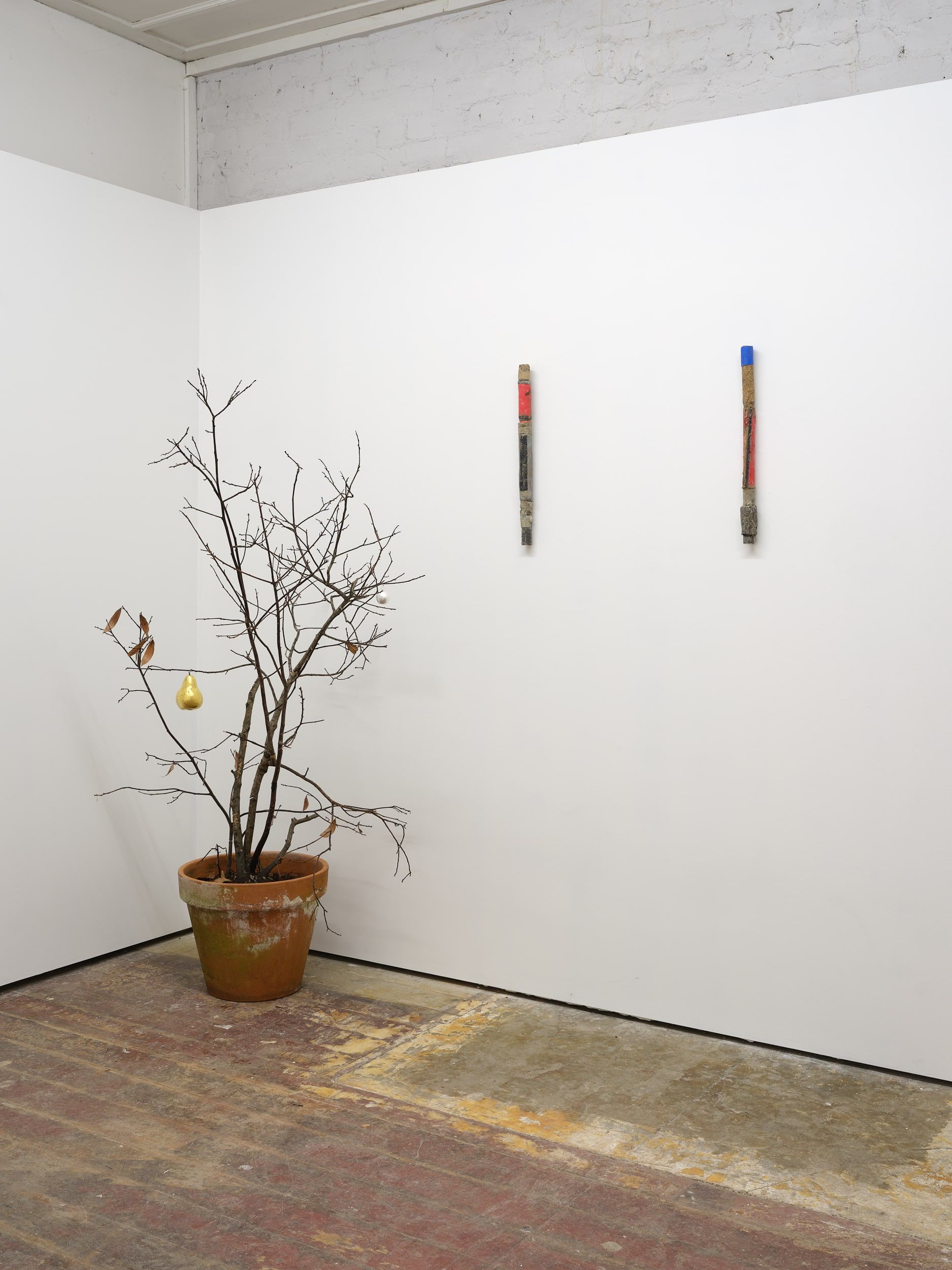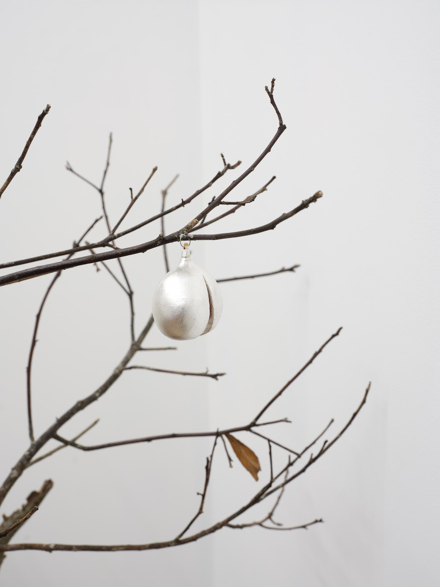 Dried bay tree, Laurus nobilis, tape, terracotta pot, vintage papier-mâché, gilded 24k pure gold pear, hand-moulded clay, gilded pure silver nutmeg