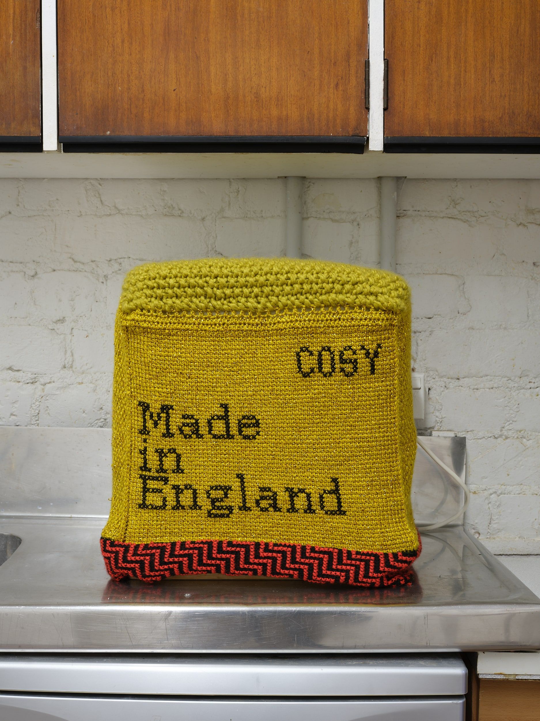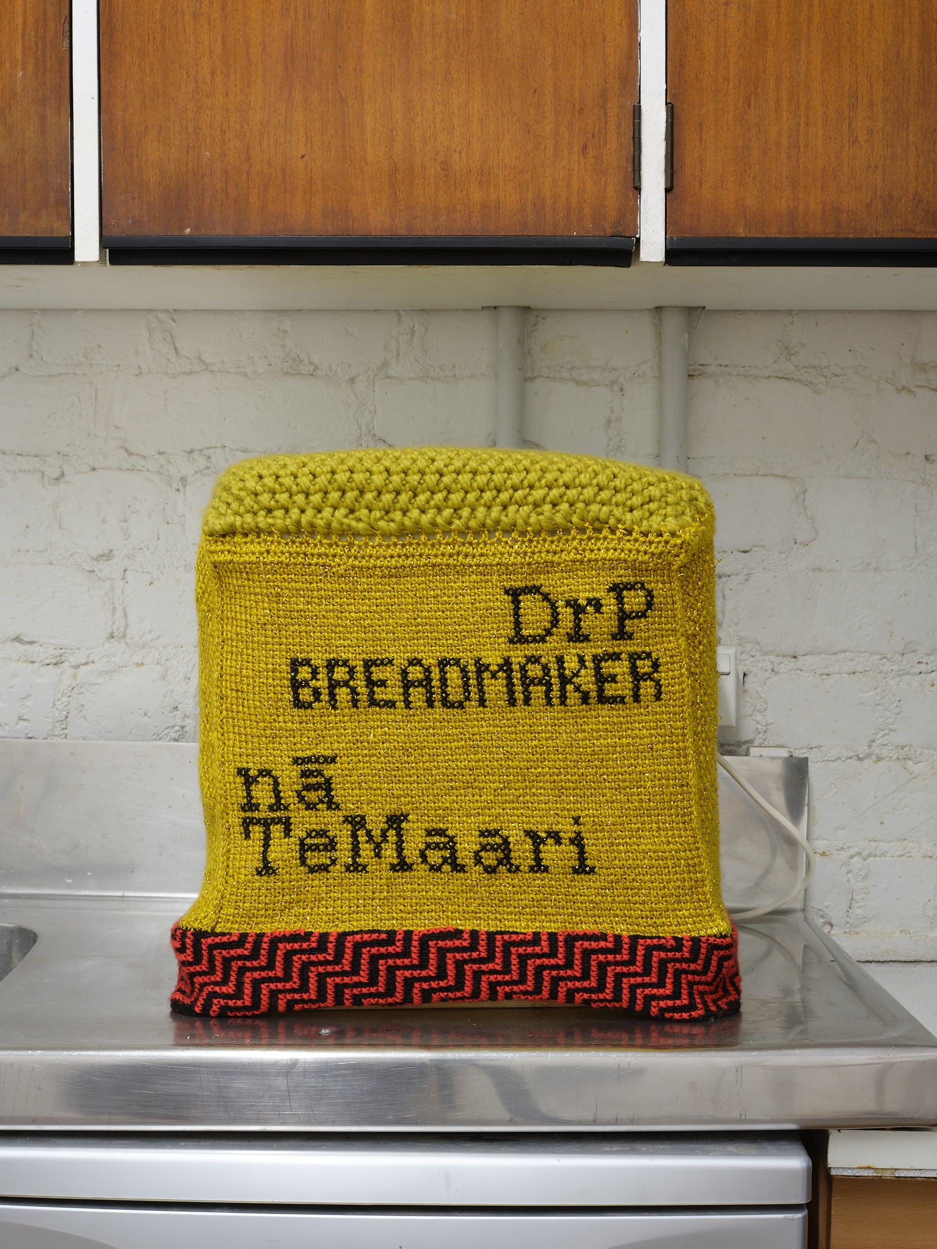 2 parts, breadmaker machine, custom tam: acrylic, synthetic fibres (knitted/crocheted elements), cotton (embroidery)