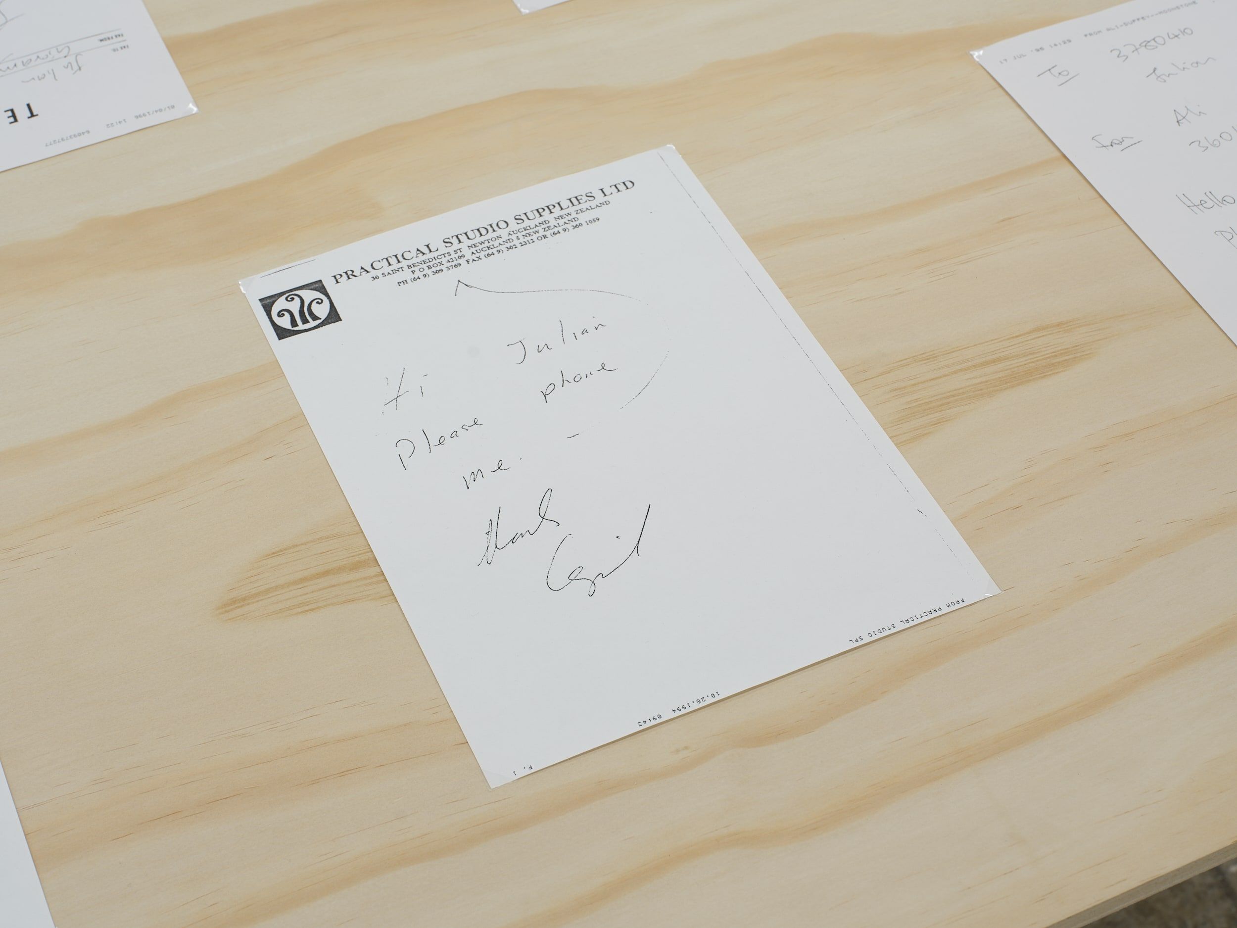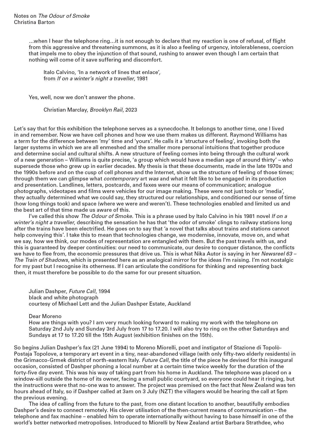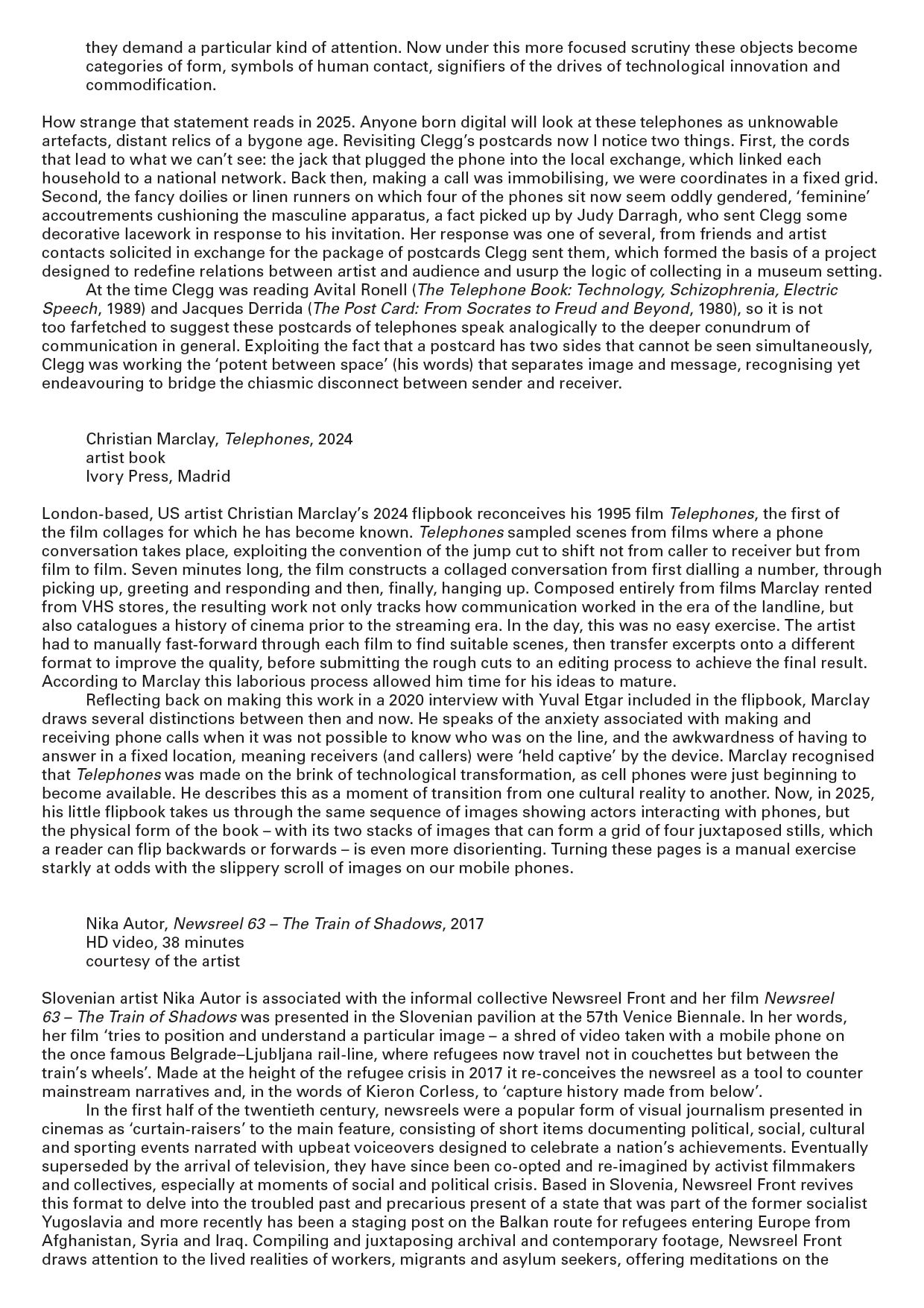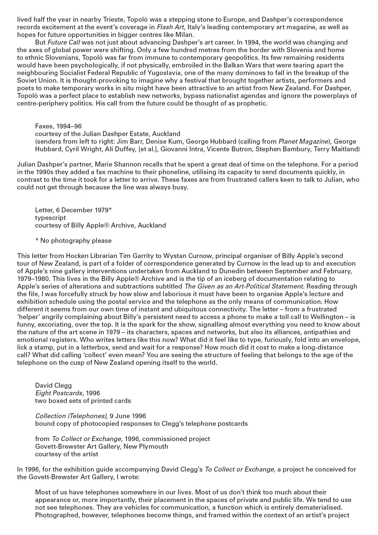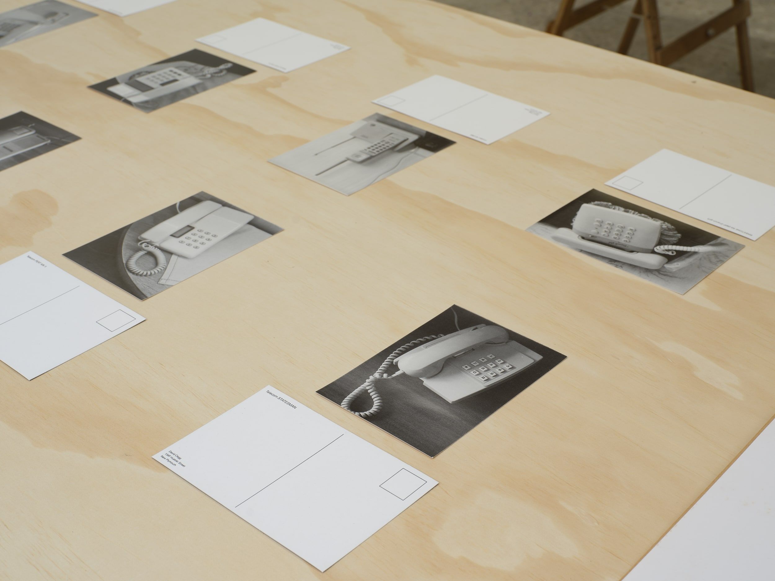 Let’s say that for this exhibition the telephone serves as a synecdoche. It belongs to another time, one I lived in and remember. Now we have cell phones and how we use them makes us different. Raymond Williams has a term for the difference between ‘my’ time and ‘yours’. He calls it a “structure of feeling”, invoking both the larger systems in which we are all enmeshed and the smaller more personal intuitions that together produce and determine social and cultural shifts. A new structure of feeling comes into being through the cultural work of a new generation – Williams is quite precise, “a group which would have a median age of around thirty” – who supersede those who grew up in earlier decades. My thesis is that these documents, made in the late 1970s and the 1990s before and on the cusp of cell phones and the Internet, show us the structure of feeling of those times; through them we can glimpse what contemporary art was and what it felt like to be engaged in its production and presentation. Landlines, letters, postcards, and faxes were our means of communication; analogue photographs, videotapes and films were vehicles for our image making. These were not just tools or ‘media’, they actually determined what we could say, they structured our relationships, and conditioned our sense of time (how long things took) and space (where we were and weren’t). These technologies enabled and limited us and the best art of that time made us aware of this.